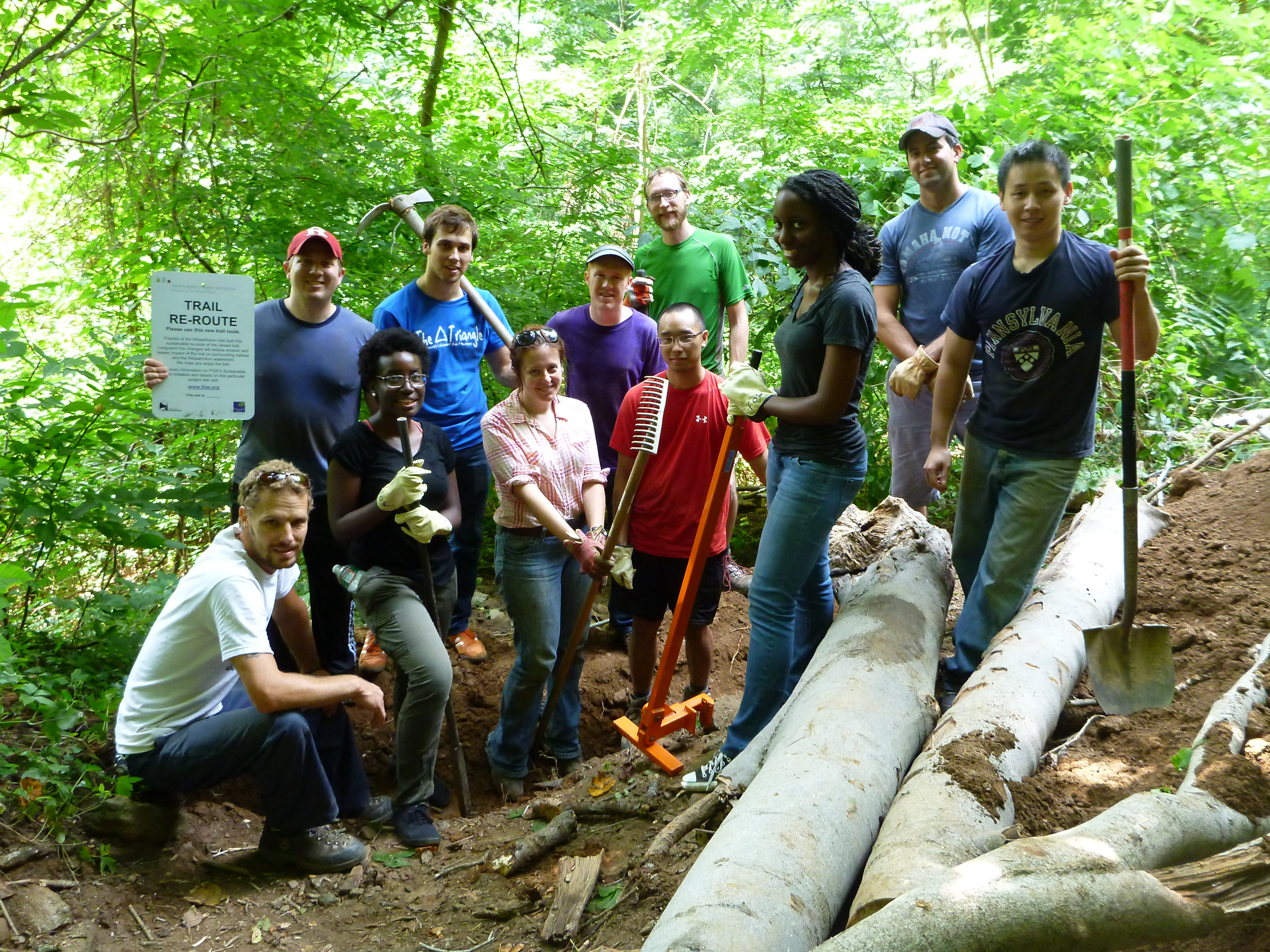 On Saturday, July 27th YMF Philadelphia teamed up with Friends of Wissahickon to complete a trail restoration project in Wissahickon Park. The volunteers closed a section of erosive trail, redirecting users to a new path. The crew moved rocks and soil from stock areas, cut tread, removed invasive species, built check dams to help prevent erosion during storm events and restored the section of erosive trail to promote vegetation.