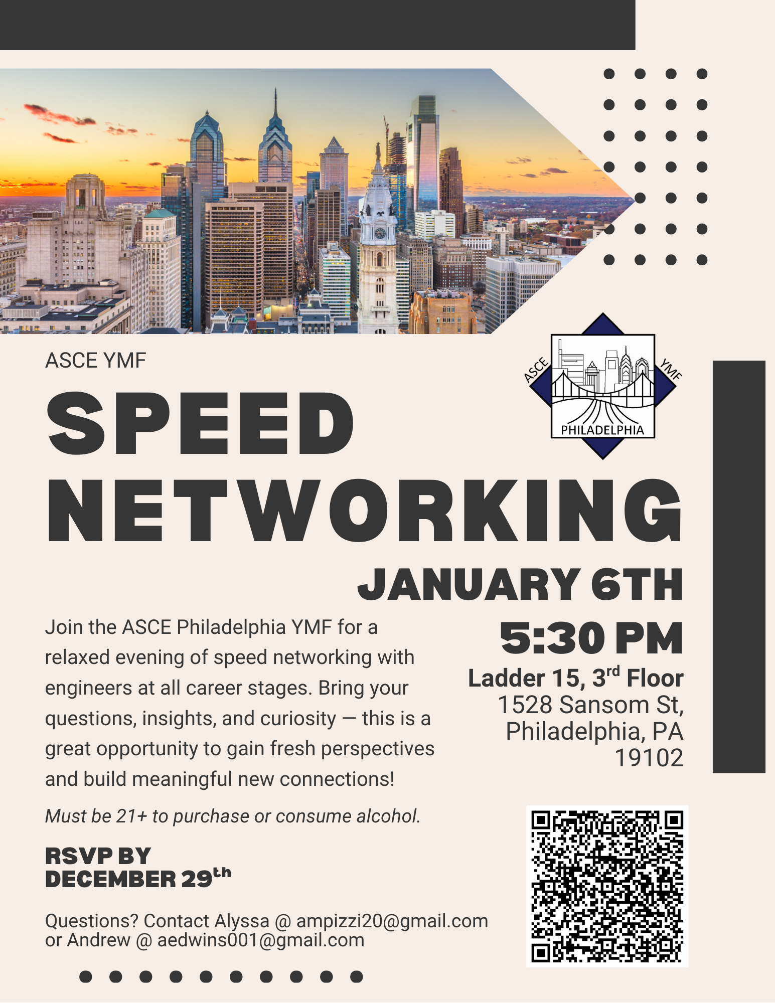 Please join the ASCE Philadelphia YMF for our Reverse Mentor Happy Hour. The Reverse Mentor Happy Hour will bring together engineers at all career stages to share experiences, insights, and advice in a relaxed setting. Whether you’re looking to mentor a younger engineer, learn from someone with fresh perspectives, or simply expand your professional network, this event is a great opportunity to build your network and gain insight on the engineering community. Food will be provided! A cash bar will be available, must be 21+ and older to purchase alcohol.